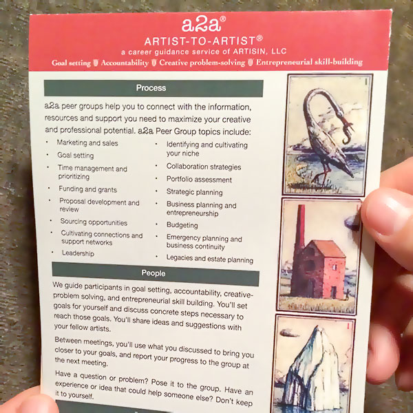 Artists of all disciplines share a unique set of goals and obstacles, and you’re no different. In an a2a guided peer group, you’ll be part a group of up to 10 participants — artists of all disciplines — who meet monthly for three, six or nine months. You’ll work as a group with your experienced facilitator who can help you find your way around those seemingly impossible obstacles.